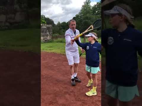 Værktøjets håndtag er formet som en almindelig tennisketsjer (ottekantet) for at give dig den rigtige grebsfølelse, men også for at øve den korrekte placering af hånden . Håndtaget er pakket ind med en gribende vikle. Du kan også tilføje en ekstra indpakning, hvis du ønsker et større greb eller højere greb. Farven og mærket på den medfølgende indpakning kan variere. Som med din almindelige tennisketcher, skal du skifte omslag, når den ikke længere opfylder sin gribefunktion.