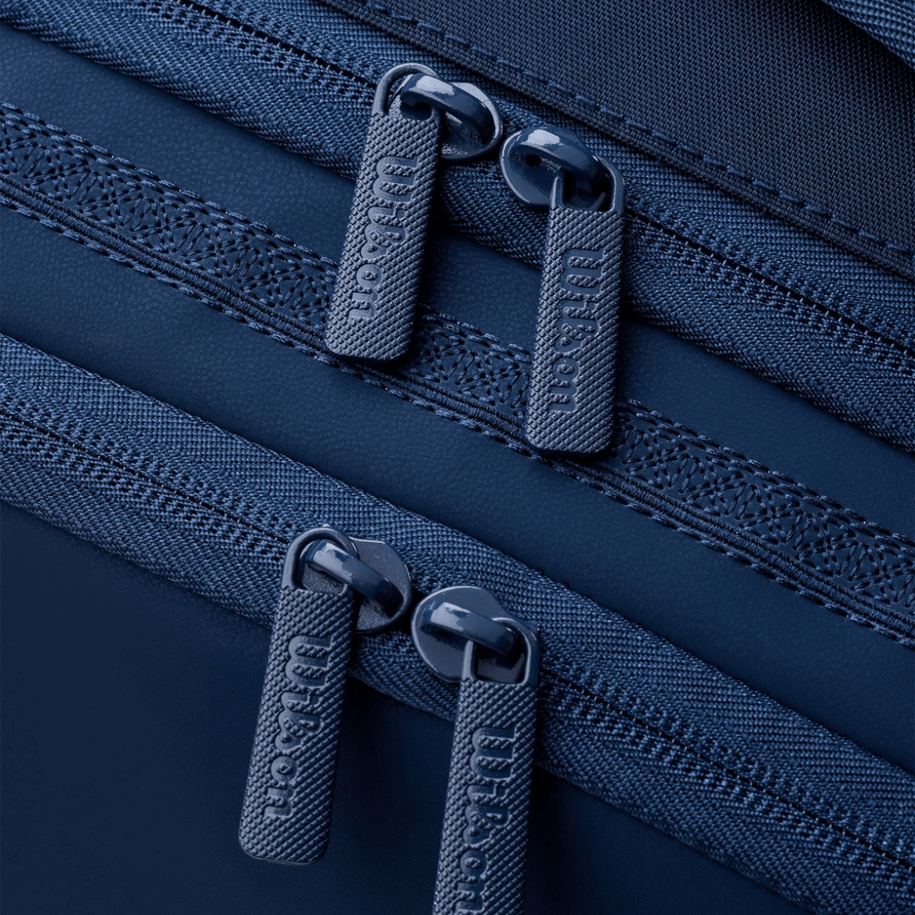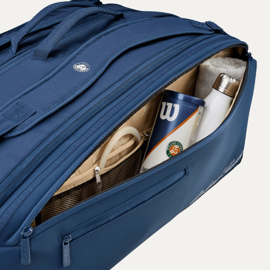 Oplev Wilson Roland Garros 2026 Session de Soirée 15-Pack Bag Navy/Clay - en tour-inspireret tennisketcher-taske designet til tennisspillere, der kræver maksimal kapacitet og beskyttelse. Designet er en hyldest til de ikoniske nattesessioner på Roland-Garros med et elegant Navy/Clay-farveskema. De tre rummelige hovedrum kan rumme op til 15 ketsjere samt tøj og udstyr. To af rummene er udstyret med Thermoguard-foring for at beskytte ketsjere og strenge mod temperaturændringer. Separat skotøjsrum og to store siderum giver smart og organiseret opbevaring.